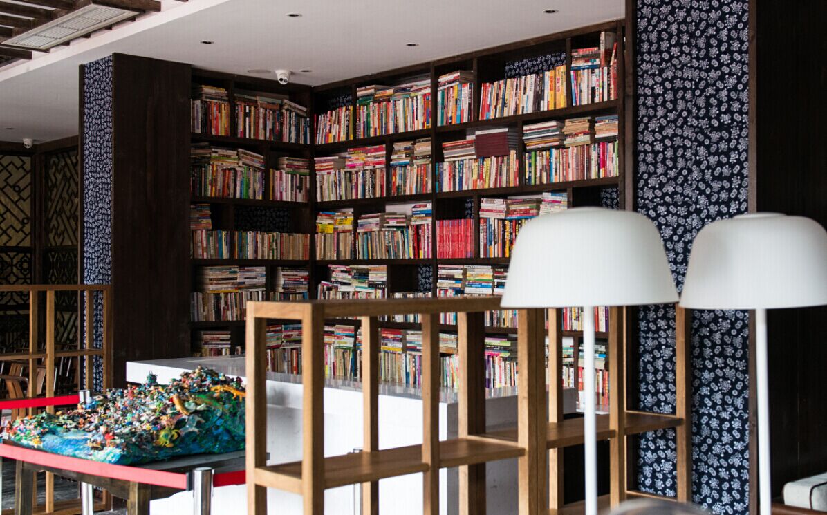 大廳劃分有書吧和小酒吧相結(jié)合的公共區(qū)域。放滿各類書籍的木質(zhì)書架、擱置于卡座旁的高腳落地臺燈、屋頂和房梁立柱間的藍(lán)布印花,以及環(huán)繞大廳的油畫與裝置作品,無不給域上?書香青年旅舍增添了一份與藝術(shù)共生的氛圍和氣場。在這里,可以看書、小酌、結(jié)交志同道合的朋友,待到燈火闌珊之時亦可穿梭于三國文化體驗街區(qū),享美食與風(fēng)情,讓旅行入住也有在家一般的溫暖情懷和精致享受。