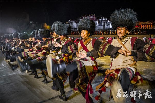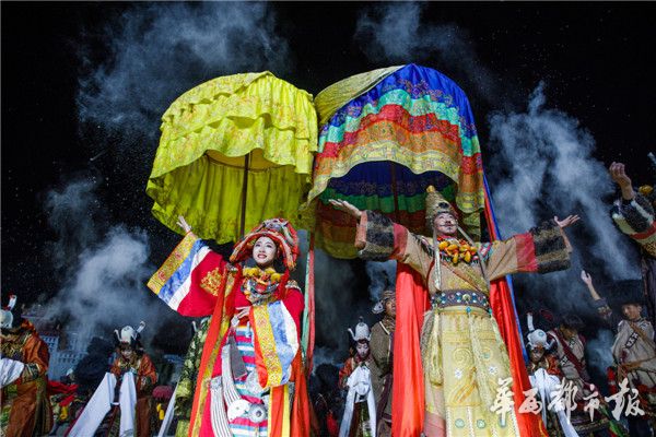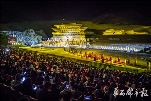 “天下沒有遠(yuǎn)方,人間都是故鄉(xiāng)……”4月20日晚,拉薩河畔,沉寂了近半年的寶瓶山,再度響起悠揚(yáng)動(dòng)人的音樂與歌聲。9點(diǎn)整,《文成公主》藏文化大型史詩劇第五季演出正式開啟大幕。暮色漸晚,音樂響起,燈光放亮,在高原星空下、山川間,文劇講述著跨越千年時(shí)空的藏漢和美故事。篝火升騰的百人鍋莊染紅了半壁寶瓶山,打阿嘎的遁地之聲氣勢如虹。高原的夜晚寒風(fēng)陣陣,演員們匍匐、跪拜、奔跑、磕首,甚至做出撲地翻滾等舞蹈動(dòng)作。揚(yáng)天風(fēng)雪中,公主的隊(duì)伍逶迤前行,翻山越嶺、跨河淌流,組成一幅壯美的人文山水畫卷。歷經(jīng)3年漫漫長路,公主終于抵達(dá)了離天堂最近的圣城拉薩。在宏偉莊嚴(yán)的布達(dá)拉宮下,在萬人膜拜敬仰的禮贊中,文成公主與松贊干布舉行了流方至今的和美大婚。800名演員將手中的青稞粉撒向夜空,文劇第五季首演完美落下帷幕。數(shù)千中外觀眾掌聲和歡呼聲經(jīng)久不息。這部近800名演員同臺(tái)歌舞,絢麗舞臺(tái)呈現(xiàn)數(shù)十種非物質(zhì)文化遺產(chǎn)的史詩巨制,經(jīng)過此前四季演出,該實(shí)景劇已享有盛譽(yù),此次再次綻放高原,仍然吸引了各方關(guān)注,能夠容納近4000人的劇場幾無虛席。