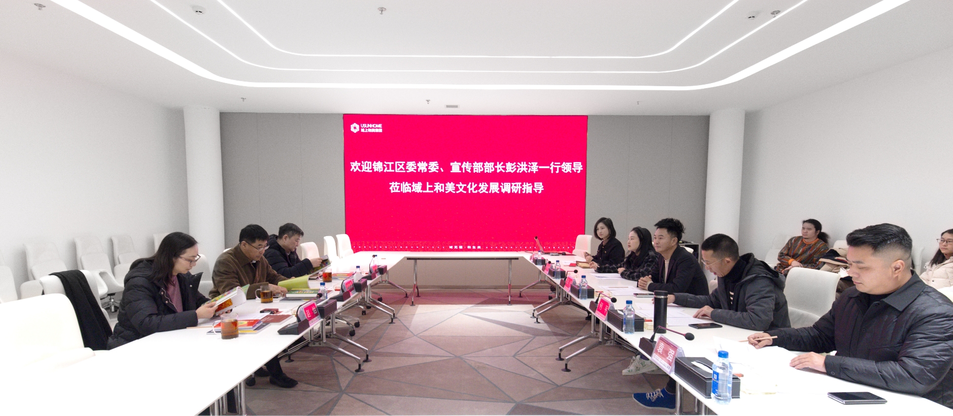 1月31日,錦江區(qū)委常委、宣傳部部長彭洪澤帶隊調(diào)研域上和美集團;集團創(chuàng)始人、董事長邱偉,集團副董事長、聯(lián)合創(chuàng)始人何平,集團執(zhí)行總裁李元媛接待彭洪澤一行并座談交流。