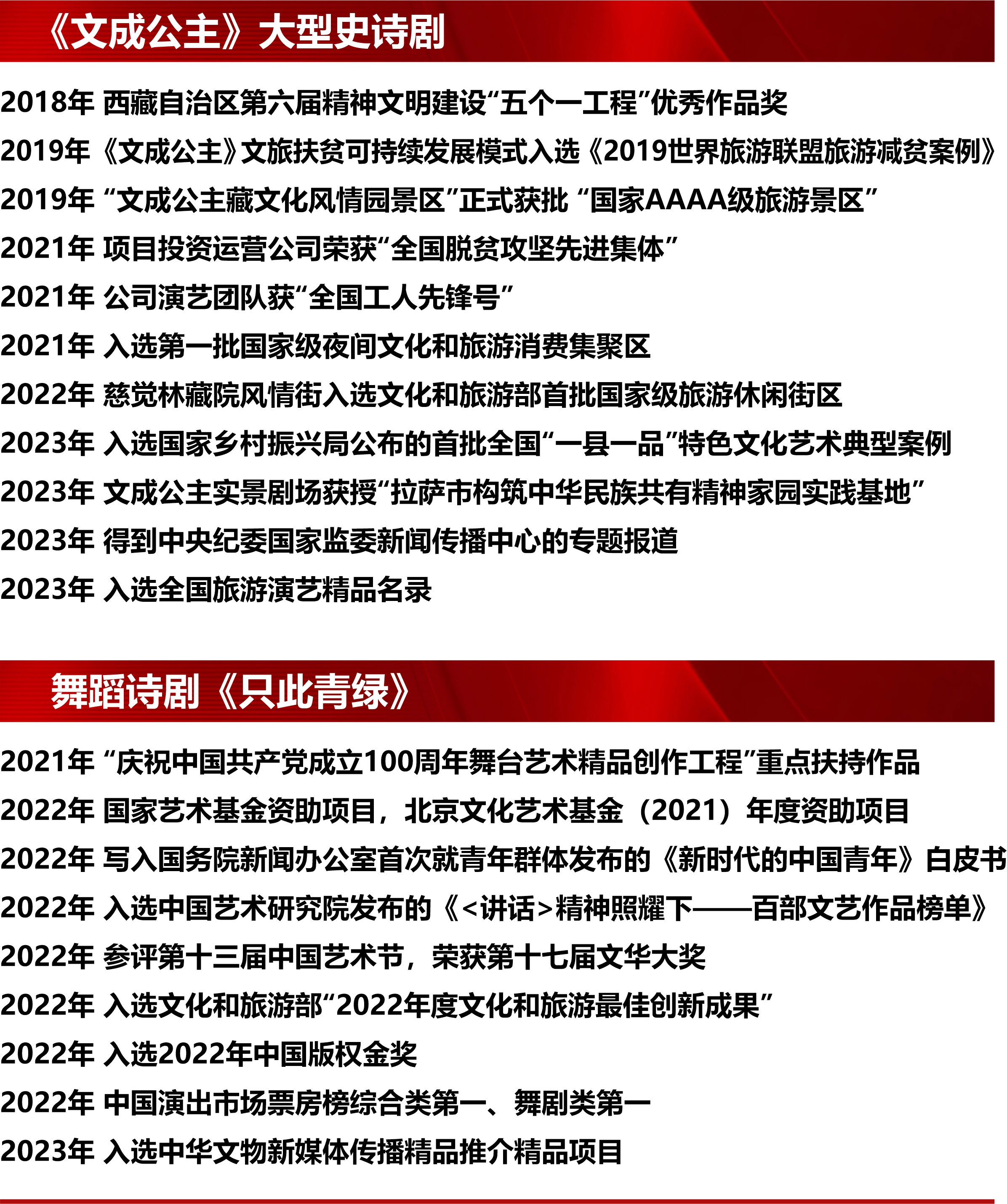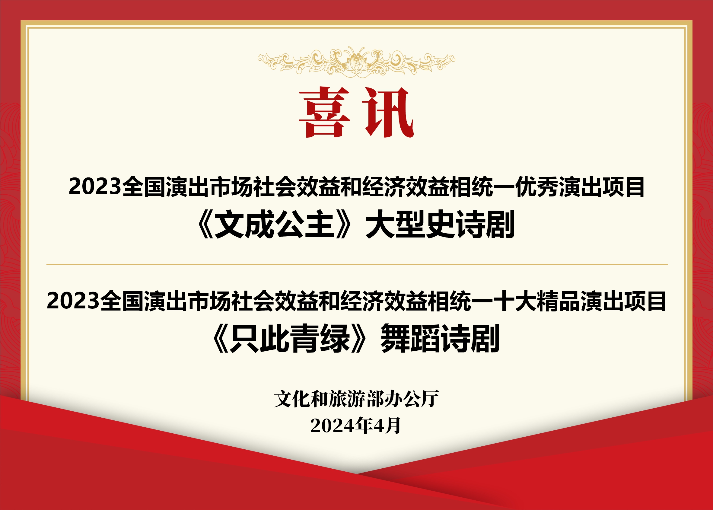 四月捷報頻傳,域上和美集團(tuán)旗下項目再獲殊榮。文化和旅游部近日公布2023全國演出市場社會效益和經(jīng)濟(jì)效益相統(tǒng)一精品演出項目入選名單,域上和美文化旅游股份有限公司出品的《文成公主》大型史詩劇入選2023全國演出市場社會效益和經(jīng)濟(jì)效益相統(tǒng)一優(yōu)秀演出項目,故宮博物院、中國東方演藝集團(tuán)有限公司、人民網(wǎng)股份有限公司共同出品,域上和美文化發(fā)展有限公司聯(lián)合出品的舞蹈詩劇《只此青綠》入選2023全國演出市場社會效益和經(jīng)濟(jì)效益相統(tǒng)一十大精品演出項目。作為深耕文旅行業(yè)的大型領(lǐng)軍企業(yè),域上和美集團(tuán)勇?lián)厝?、主動作為,以持續(xù)的演藝經(jīng)典和產(chǎn)業(yè)貢獻(xiàn),服務(wù)文化旅游深度融合進(jìn)程,滿足廣大人民群眾的精神文化需求。